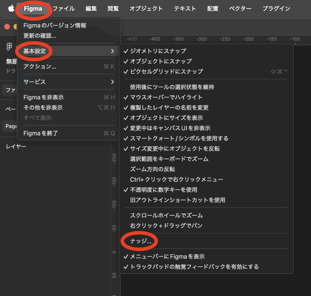 初期設定を行うために、左上の「Figma」から「基本設定」→「ナッジ」と選択していきます。